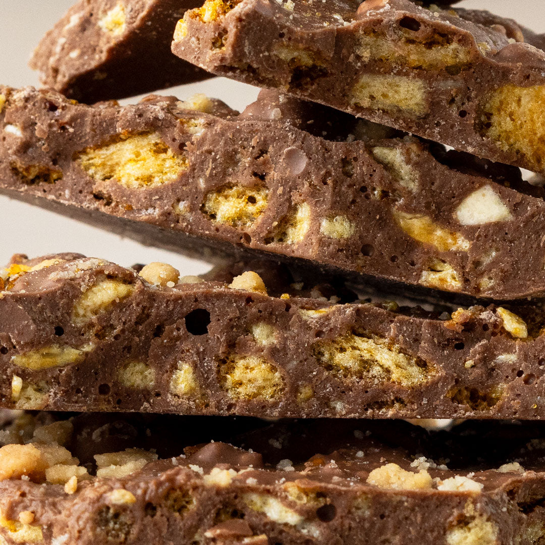 Our handcrafted chocolate barks are a playful mosaic of textures and flavours. From the zing of raspberry to the crunch of honeycomb, each slab invites you to break, share, and savour.
