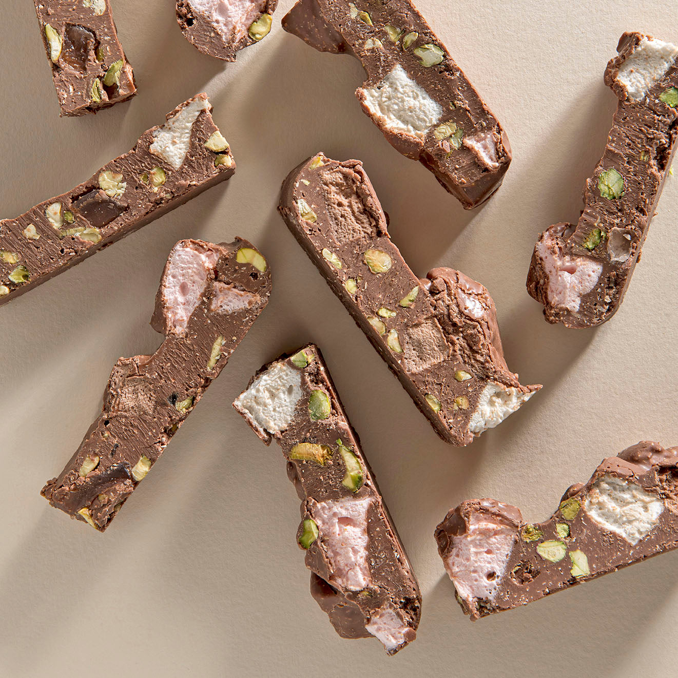 A delightful medley of textures awaits in our Rocky Road. Soft marshmallows, chewy Turkish delight, crunchy nuts, and a sprinkle of coconut, all enveloped in rich chocolate, make for a timeless treat.
